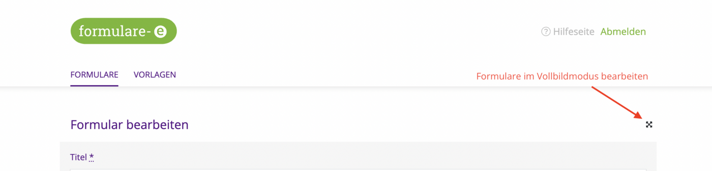 Die Arbeit mit dem neuen Editor wird durch den Vollbildmodus deutlich leichter. Wenn Sie Ihre Formulare bearbeiten, können Sie mit Klick auf das Pfeilsymbol im oberen rechten Bildschirmrand in den Vollbildmodus wechseln.